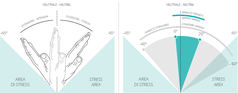 Le manche Infinity permet au poignet de rester en position neutre, ce qui réduit considérablement l'effort, contrairement aux poignées standard qui le soumettent à de fortes extensions de flexion qui peuvent provoquer l'apparition de troubles musculo-squelettiques au fil du temps.